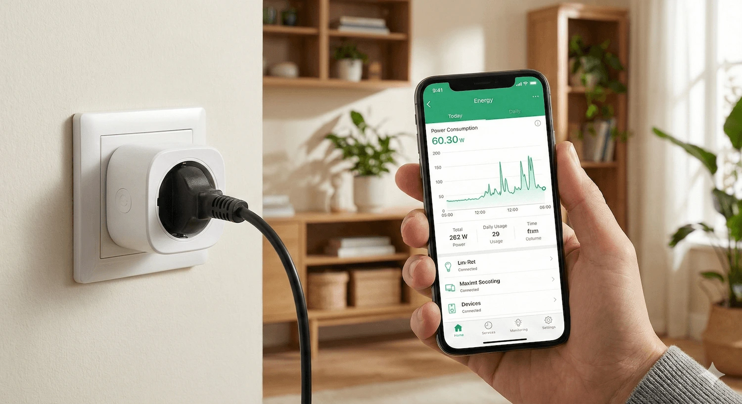 - Start de meting: Plaats de slimme stekker tussen het stopcontact en het apparaat. Zorg dat de stekker verbonden is met je app.